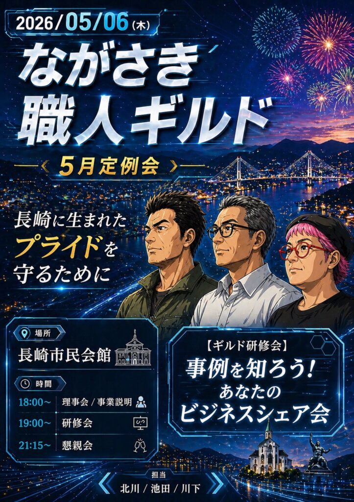 2026年5月6日 長崎職人ギルド定例会 2026 4/26 お知らせ 2026年4月26日 共有: Facebook で共有 (新しいウィンドウで開きます) Facebook X で共有 (新しいウィンドウで開きます) X いいね:いいね 読み込み中… 関連 お知らせ おやかた ながさき職人ギルド イベント 定例会 よかったらシェアしてね! URLをコピーしました! URLをコピーしました! 長崎職人ギルドのビジネスマッチング大会 この記事を書いた人 oyakata 関連記事 長崎職人ギルドのビジネスマッチング大会 2026年3月5日 乞うご期待♫ 2026年2月4日 20260108職人ギルド新年大集合 2025年12月25日 2025年3月6日ながさき職人ギルド・事業説明会・異業種交流会 2025年3月6日 コメント コメントする コメントをキャンセルコメント ※ 名前 ※ メール ※ サイト 次回のコメントで使用するためブラウザーに自分の名前、メールアドレス、サイトを保存する。